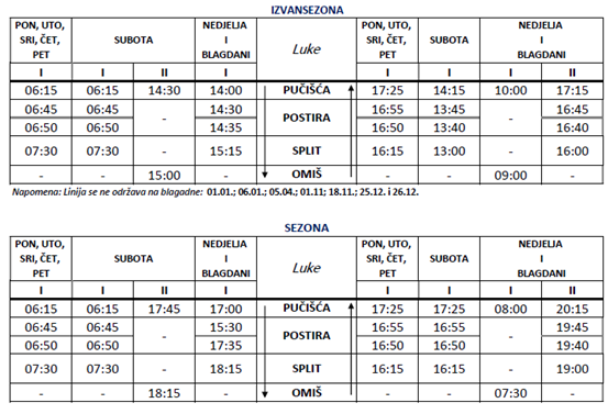 – između luke Pučišća na otoku Braču, luke Postira na otoku Braču, luke Omiš na kopnu i luke Split na kopnu te obratno,